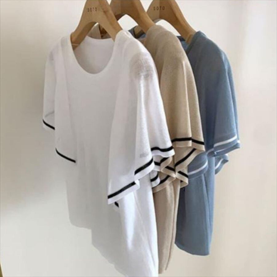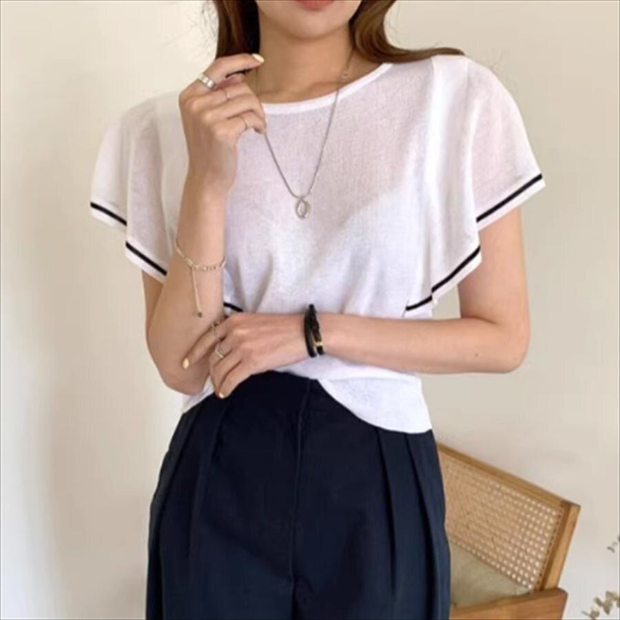 フレアスリーブの半袖Tシャツ。