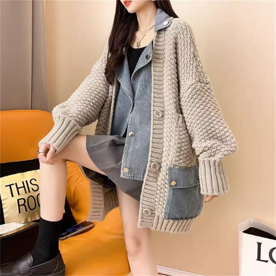 異素材ドッキングが可愛いざっくりニットカーディガンです。