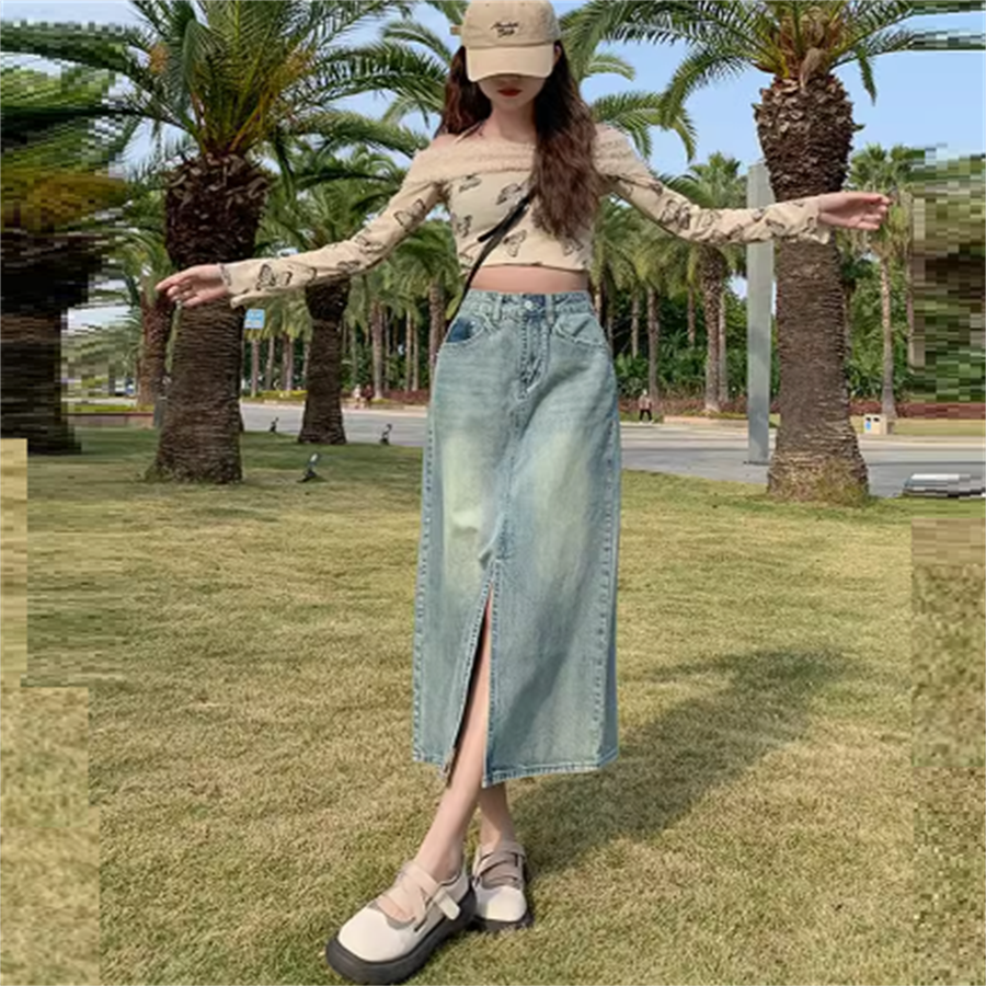 デニム生地のマキシスカートです