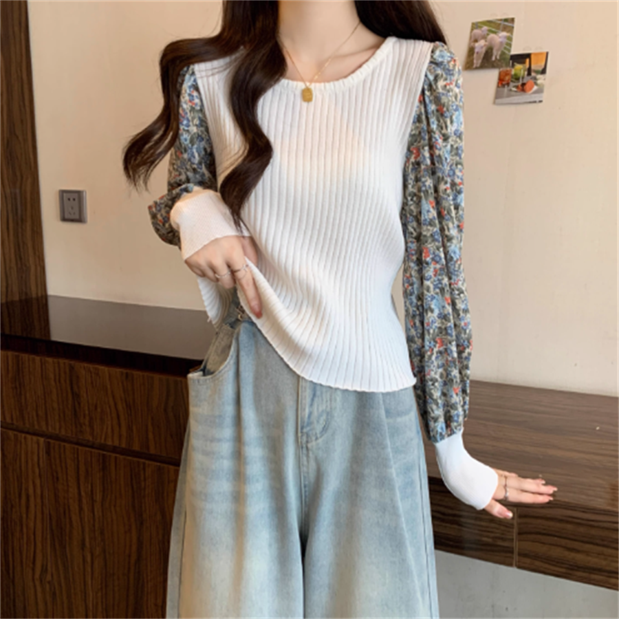 ニットとの異素材ドッキングのニットブラウスです。