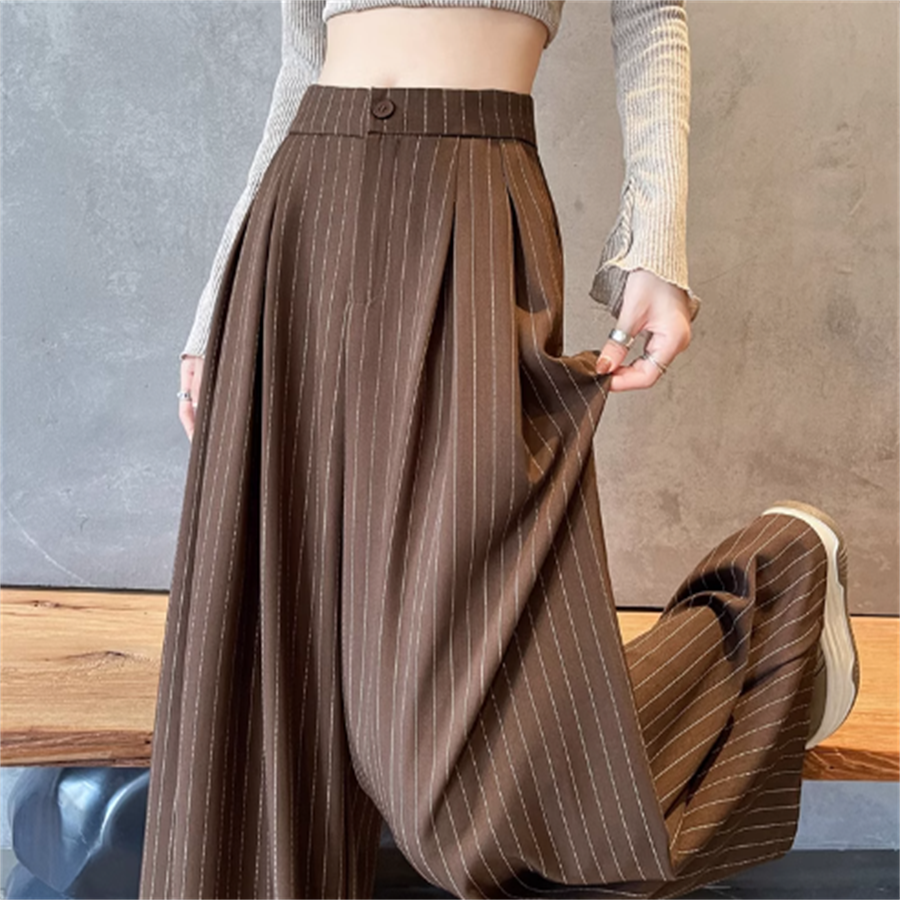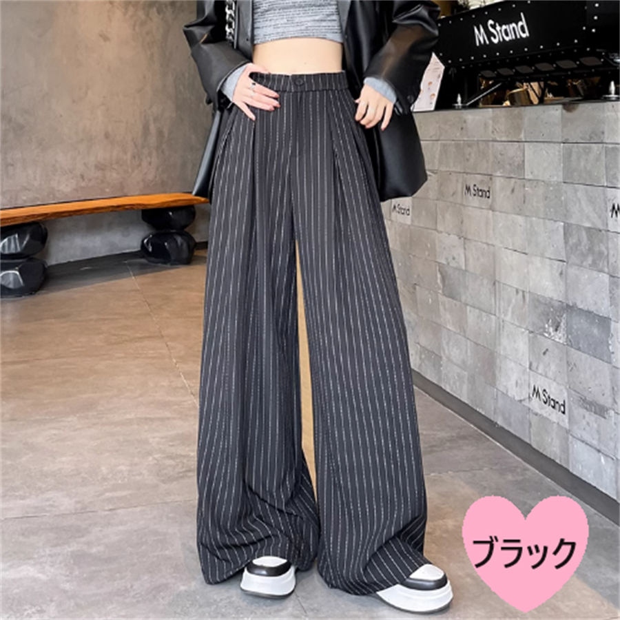 ストライプ柄ののワイドパンツ。