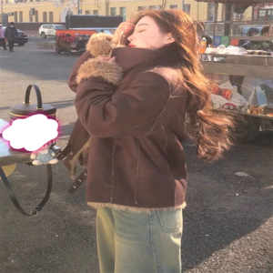 ふんわりとした女性らしさを感じさせるライダース風ジャケットです