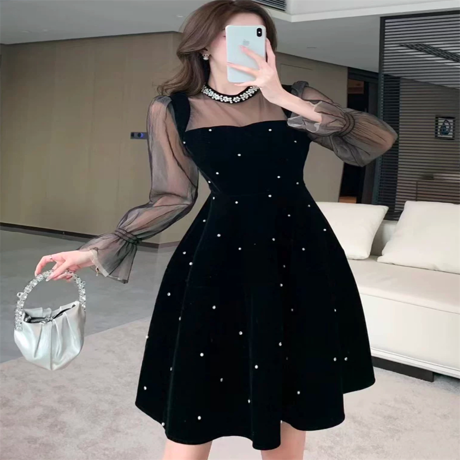 キラキラなビジューがふんだんにあしらわれた大人フェミニンなベロアドレス